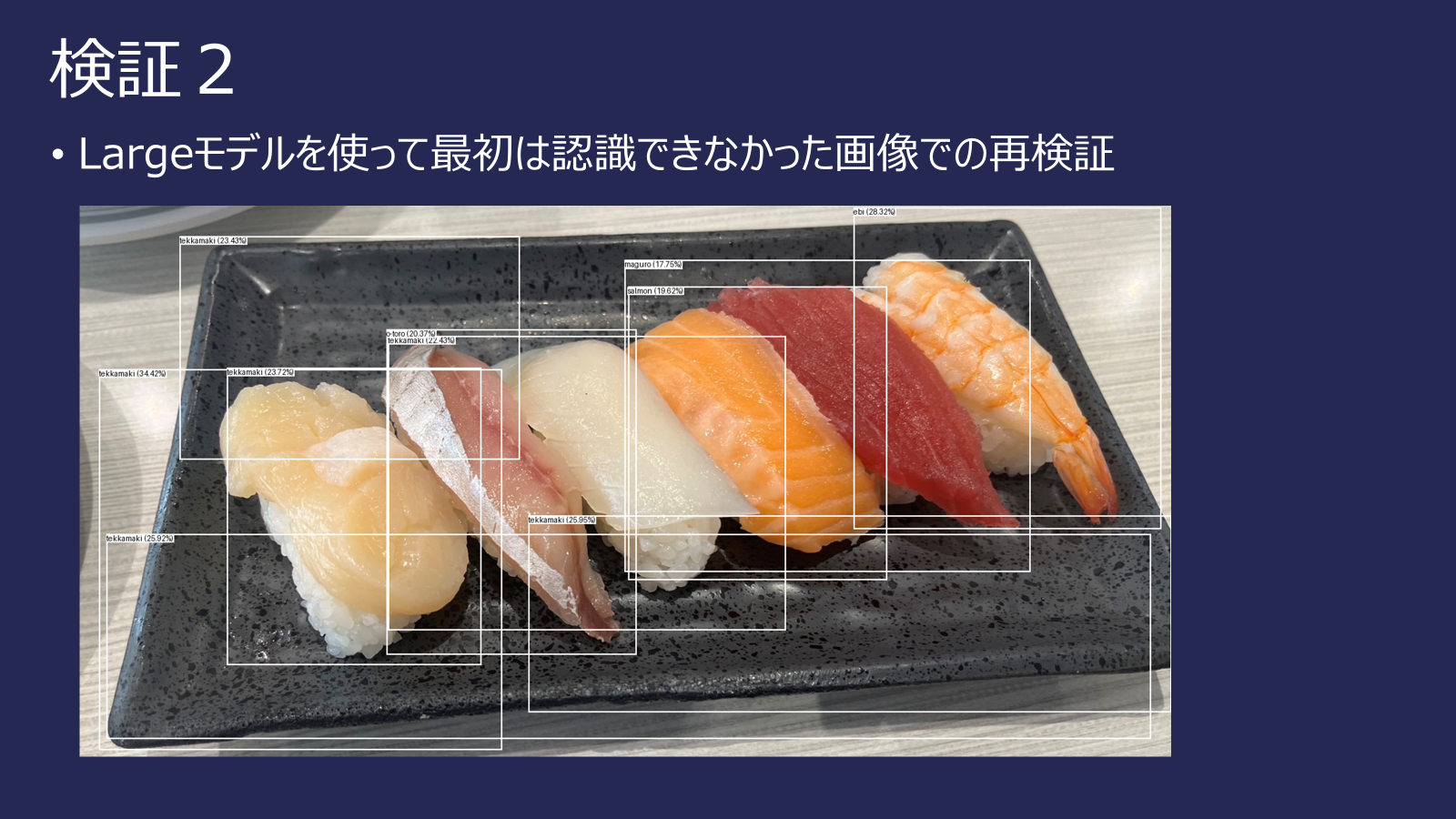 枠がズレる、あるいは信頼度が低い原因として、特定の角度や照明条件のデータがまだ不足している可能性が考えられました。「えび」のように形状が独特なものは少ない枚数でも学習が進みますが、色味や質感が似たネタを完璧に識別するには、さらなる データのバリエーション(質の管理) が不可欠だと思われます。