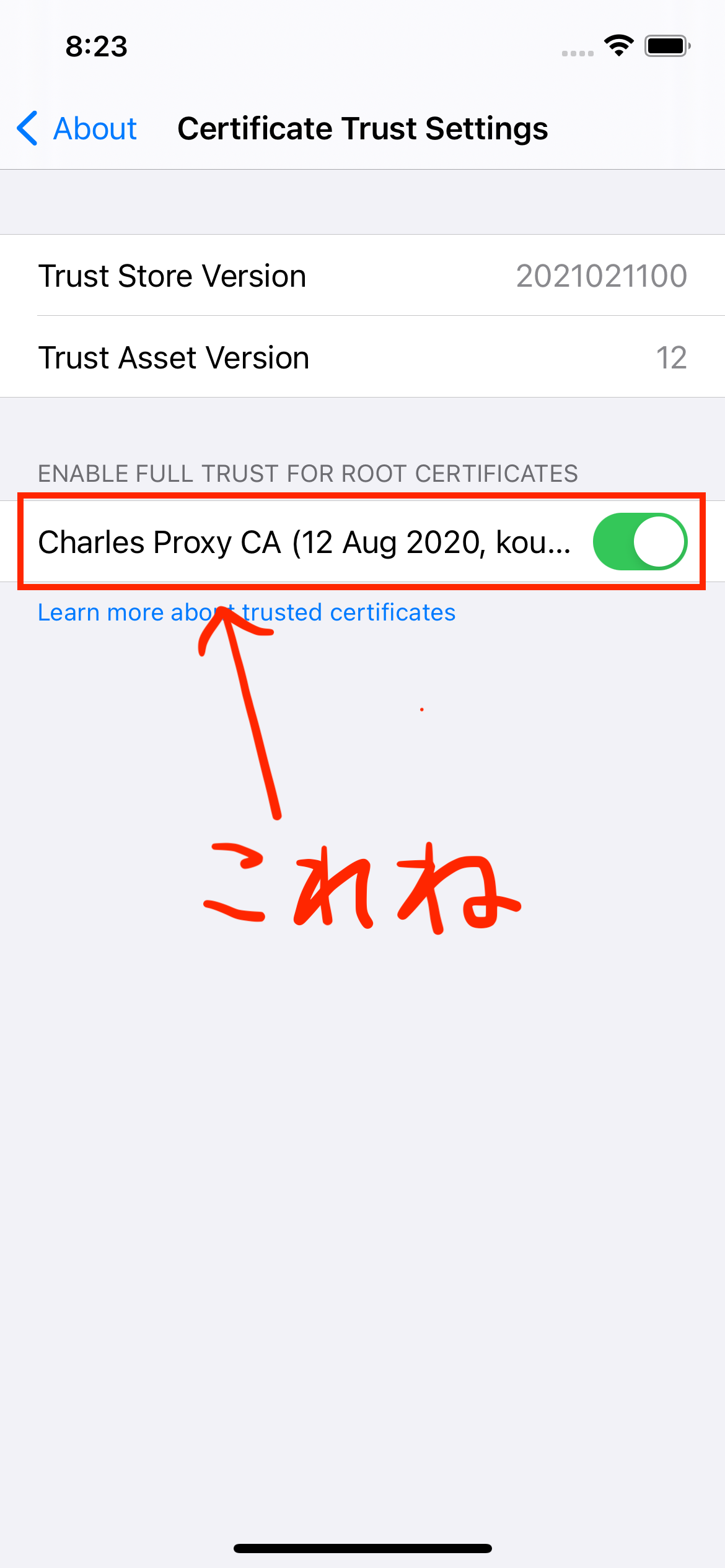 2.設計アプリのGeneral/About/Certificate Trust Settings/でChrales Proxyを有効にする。