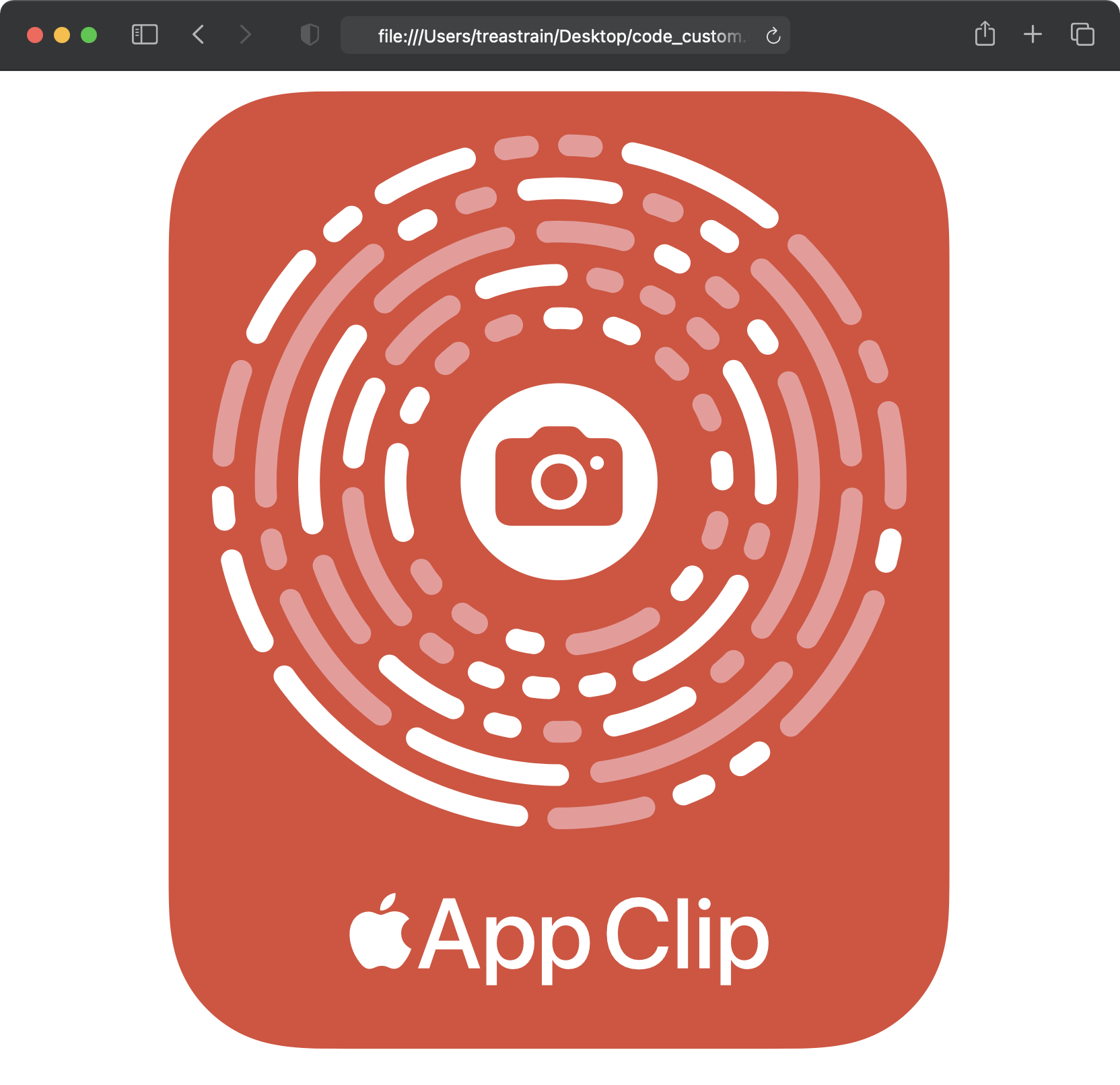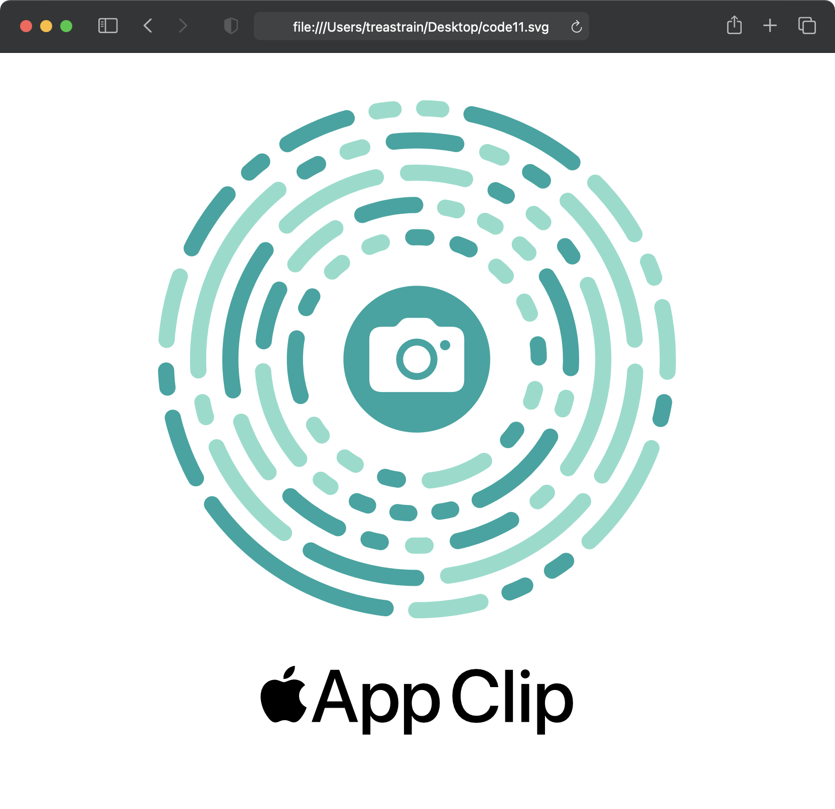 となります。実行後、App Clip Code successfully generated. と表示され、code.svg が生成されていれば成功です。実際に生成できた App Clip Code はこちらです。TYPE と LOGO_TYPE を指定しなかったので、それぞれ cam と badge になっています。