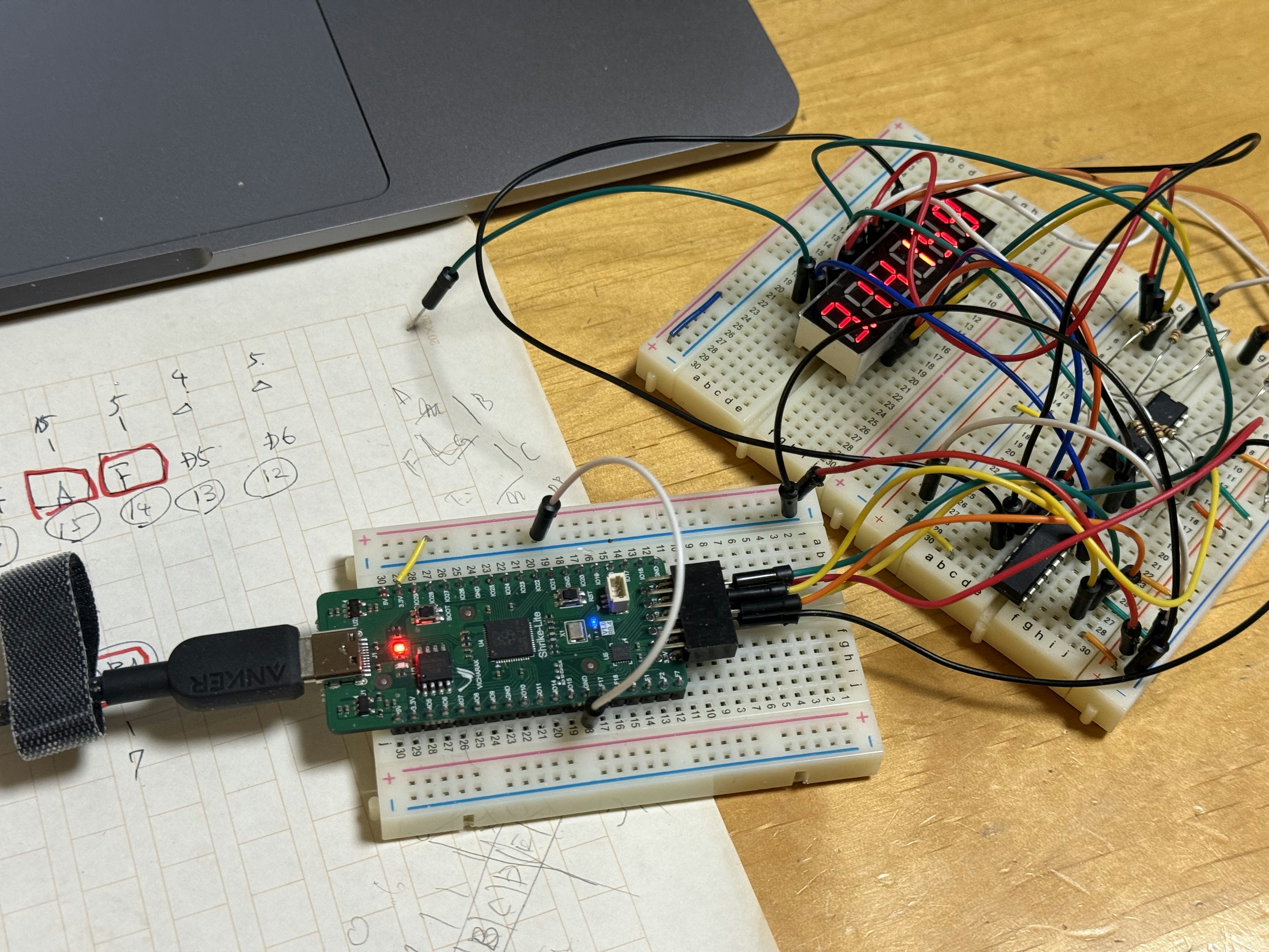 FPGA (SLG47910) に 6桁のデータを保持する表示メモリを内蔵させ、そのデータに従い表示タイミングを作り出します。RP2040 は FPGA の表示メモリに動的に表示データを書き込む制御を行います。