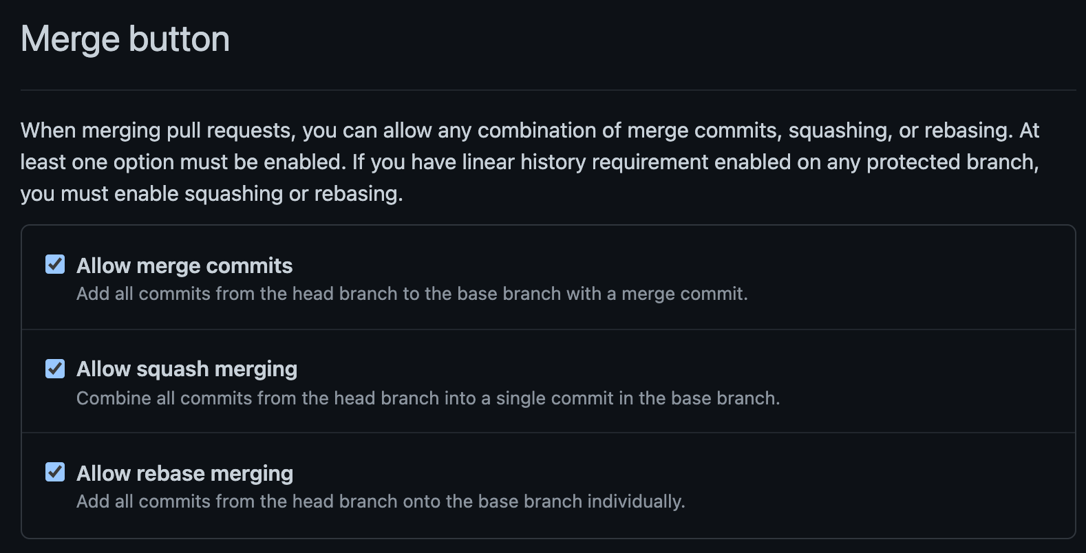 マージボタンの設定で Allow merge commits 以外のAllow squash mergingやAllow rebase mergingを採用する場合は有効化しましょう。