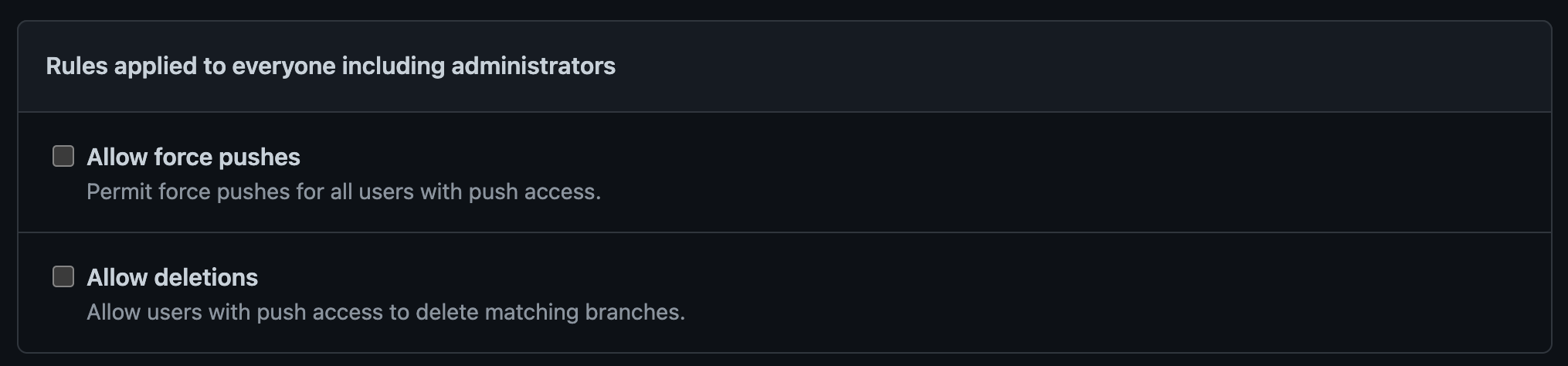 Allow force pushes: 強制プッシュを許可する。(絶対に有効化しないでください)