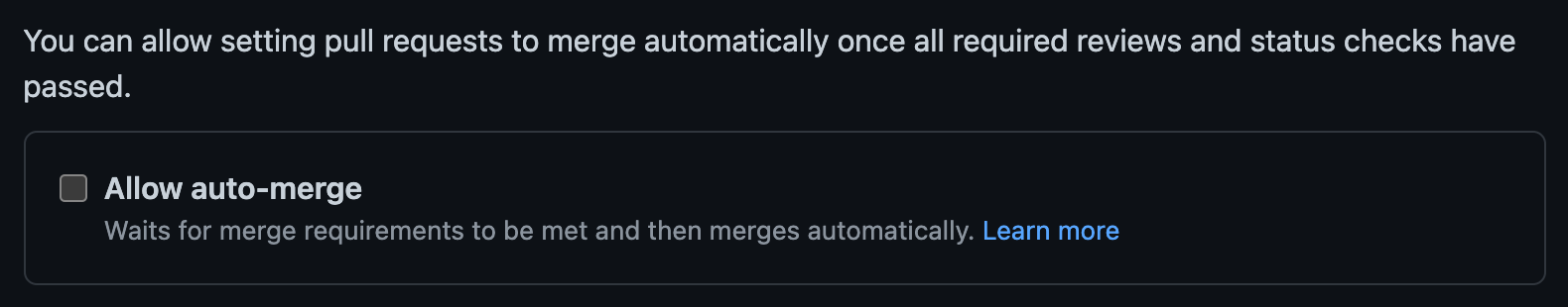 必要なレビューとステータスチェックに合格するとプルリクエストを自動的にマージする設定です。
