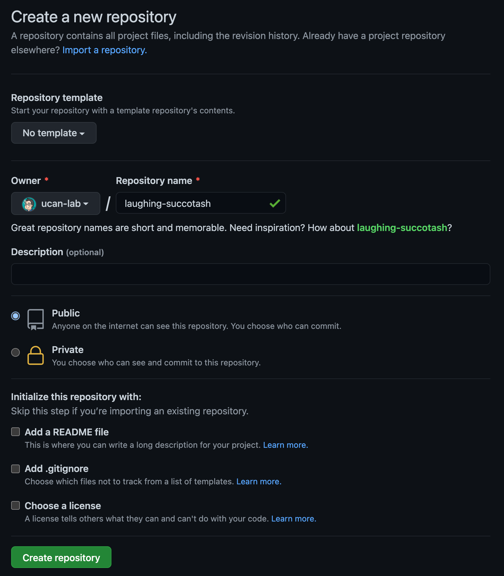Repository name: リポジトリの名称です。優れたリポジトリ名は短く覚えやすいものです。良い名前を付けましょう。GitHubがランダムなリポジトリ名を考えてくれます(笑)