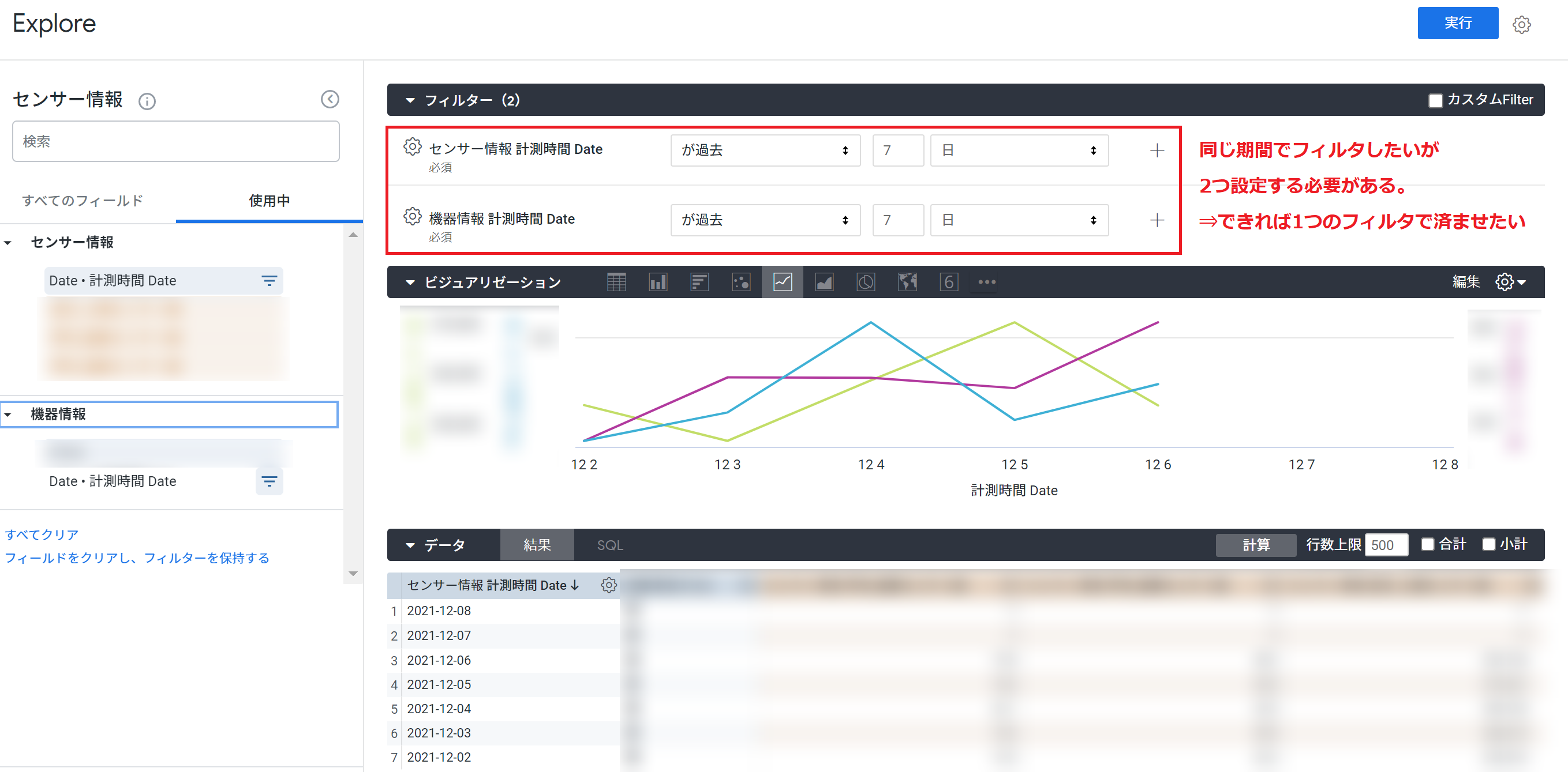 Lookerでも同じように、フィルタでtimestampを設定しなければエラーとなってしまいます。