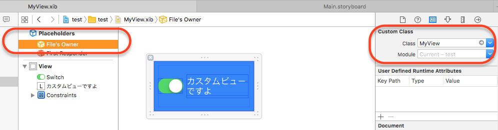 カスタムビューを xib で作って、"File's Owner" のクラスにクラス名を指定する。