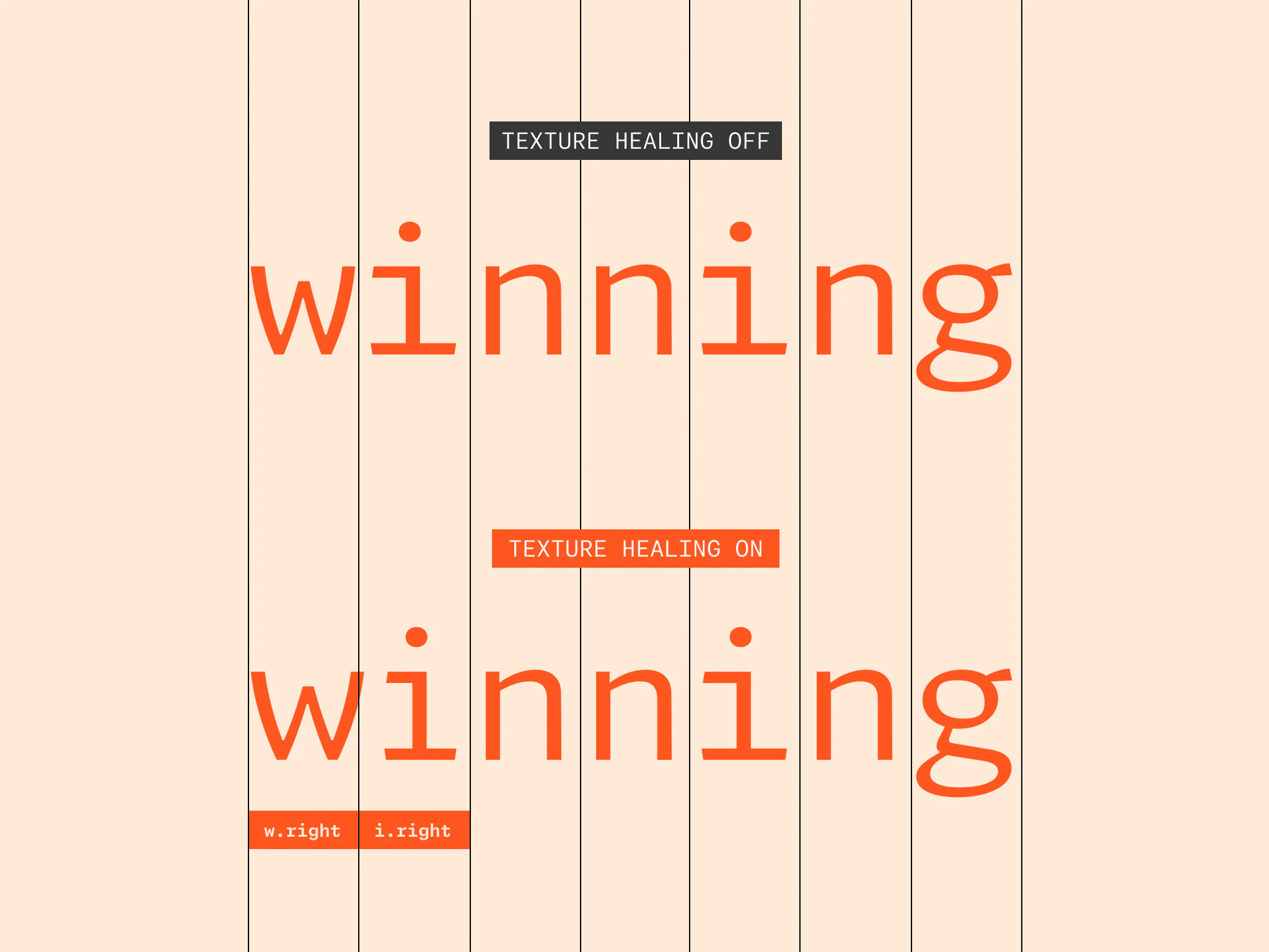これを改善するのがTexture Healingです。全体的には等幅フォントとしての幅を保ちつつ、横幅が狭い文字と広い文字が並んだときには狭い文字の幅を狭く、広い文字の幅を広くするように調整します。たとえばminimumという単語の場合、mとiが並んでいる箇所でmの幅を広く、iの幅を狭くします。これによって、等幅フォントでもバランスが良くなり、読みやすくなります。
