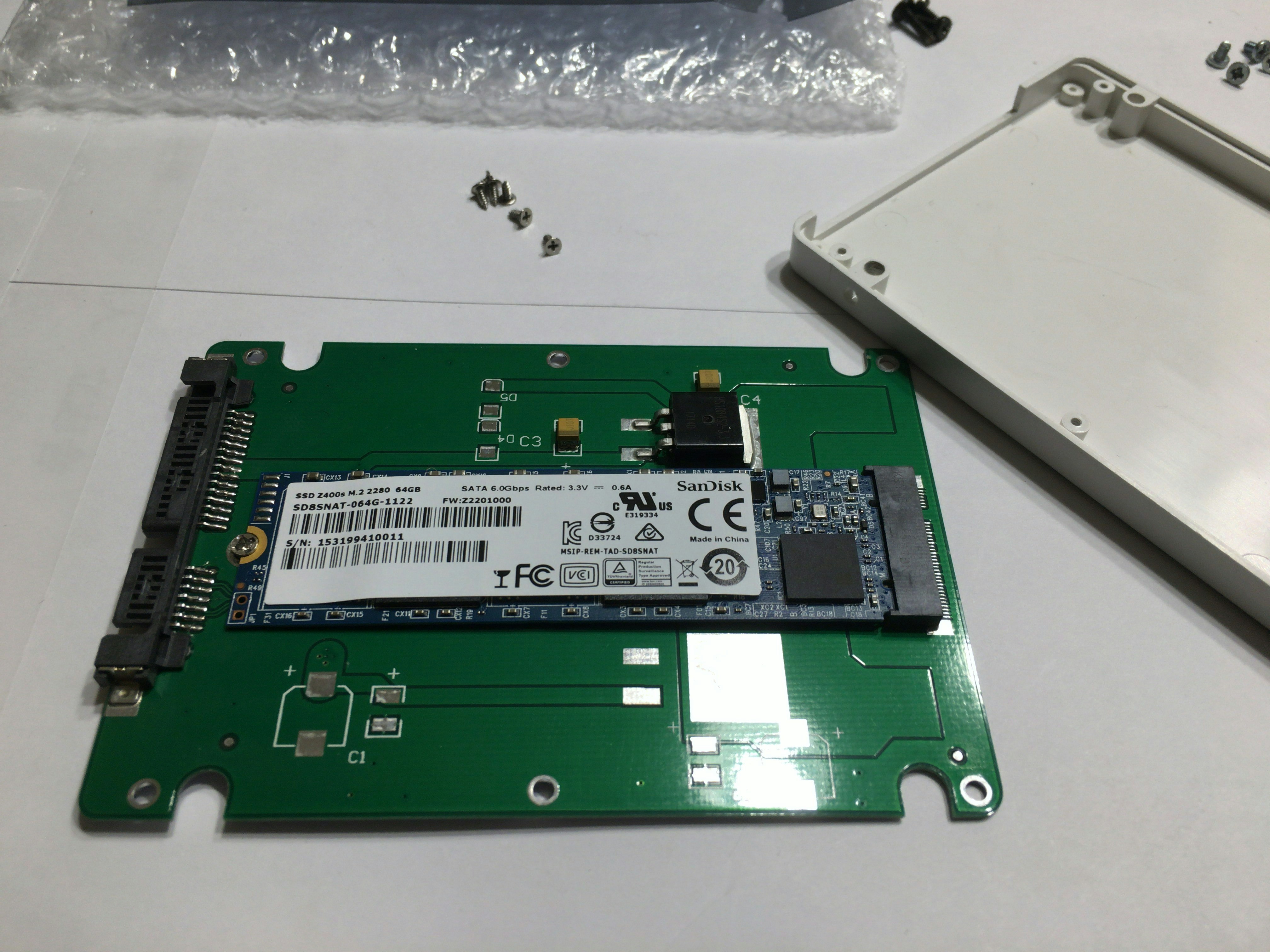 挿さっていたのはSanDiskのM.2(SATA)64GBを変換ボードにはめたものでした。何に使おうとして余っていたのでしょうか。なんと単純な回路だこと。