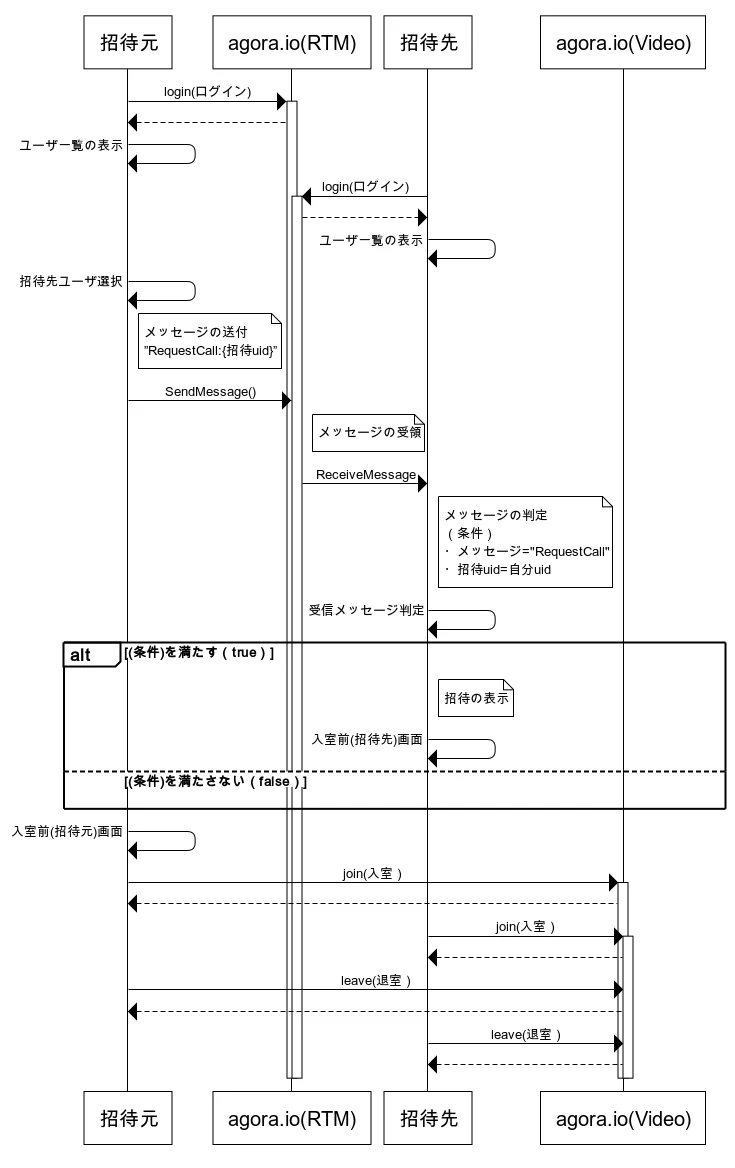 ユーザ側の画面遷移とReal-time Messaging SDKのメッセージング処理、およびVideoSDKの入室までのやりとり(流れ)をざっくりと記載したものになります。