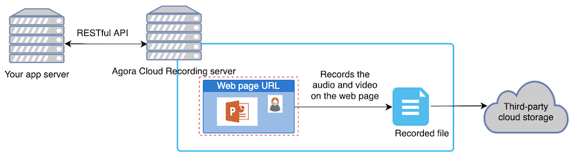 Web Page Recordingは、Cloud Recordingの録画モード(Individual/Mix/WebPage)の1つで、agora.io SDKの映像や音声と外部Webページ、又はサードパーティ製の機能を組み合わせたWebページを、1つの録画映像に保存することができます。