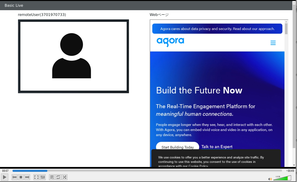 配信用Webページ(basicLive.js)は、agora.io Video SDK(Web4.x)のbasicLiveサンプルをそのまま使用します。