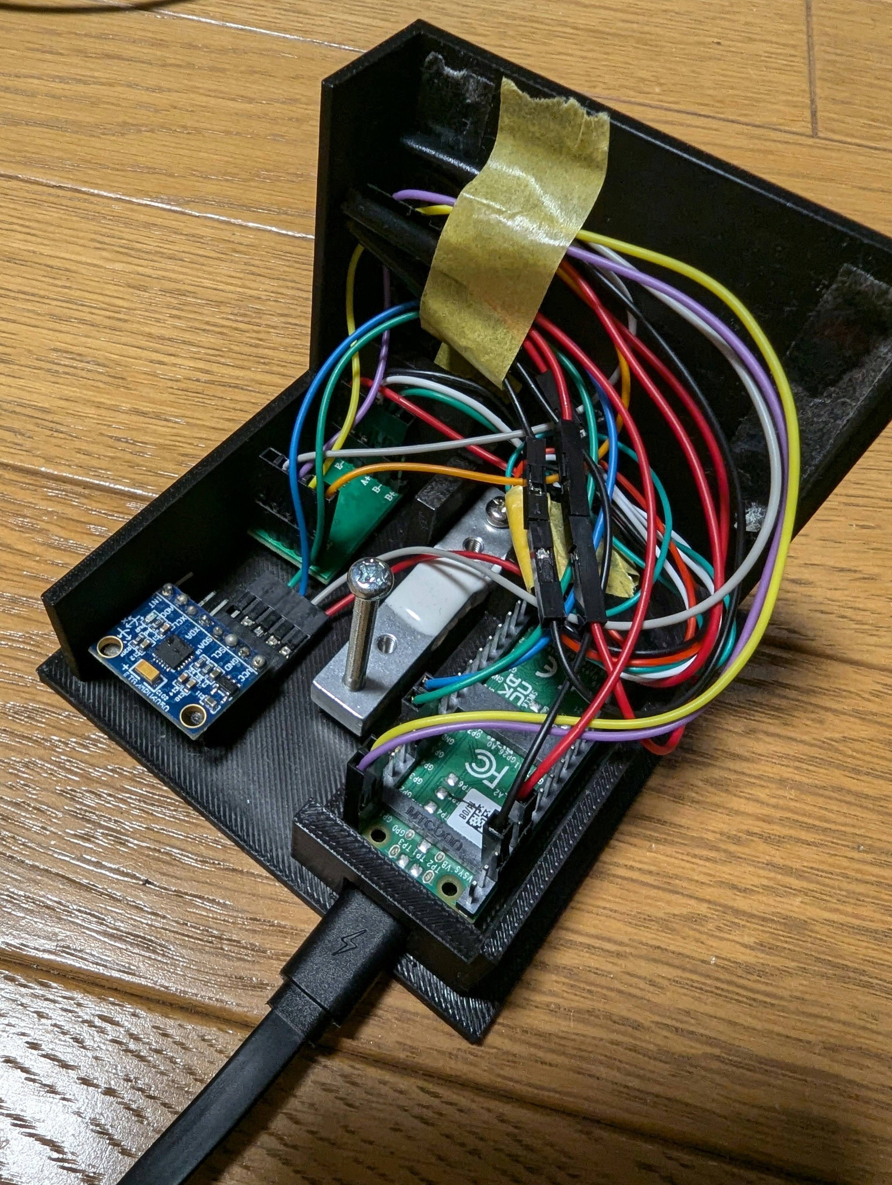 体重計に載せたお猪口で酒を飲むようなものですので、ロードセルの値は乱高下しました。取得したデータはノイズが多くかつ非常に神経質で、計測後の後処理でデータを補正しても使い物になりません。おそらく机に置いたタイミングでしか安定しなかったことでしょう。今回は飲んだタイミングと量を計測したいこともあり、デバイスを毎回机に置く想定ができないためボツとなりました。この設計を通して、なぜキッチンスケールは手に載せて重さを測らないのか、なぜ体重計はあの形状をしているのかをより深く理解することができました。やはり、市販プロダクトは考え尽くされています。