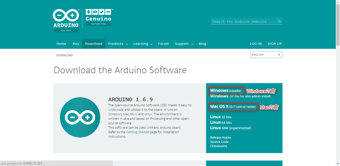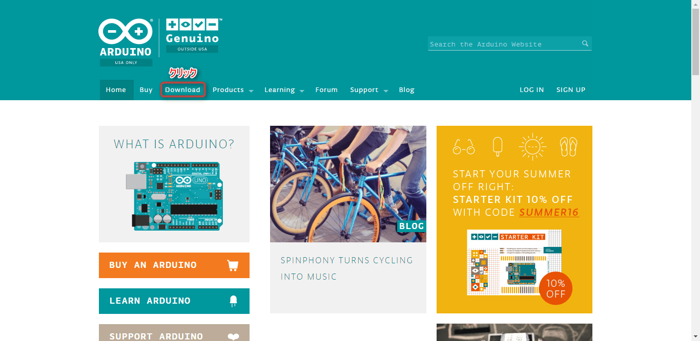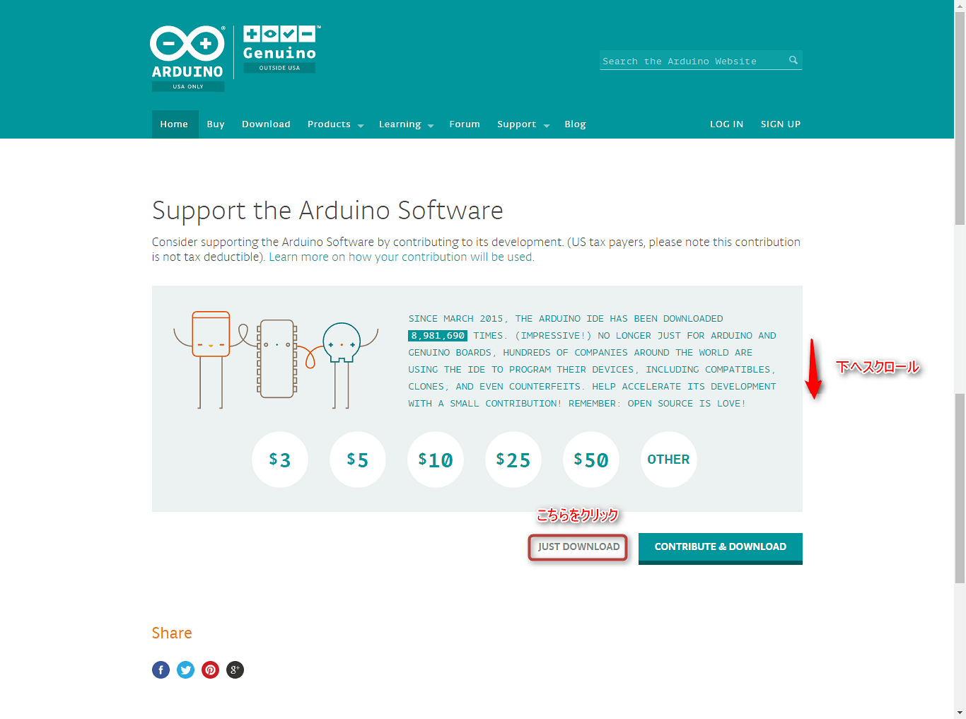 Arduinoの公式サイトからDownloadをクリックしてArduinoIDEをダウンロードします。