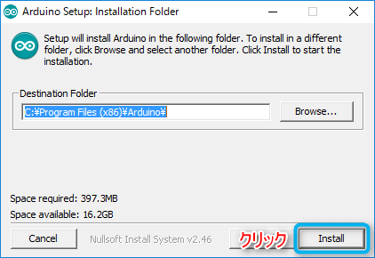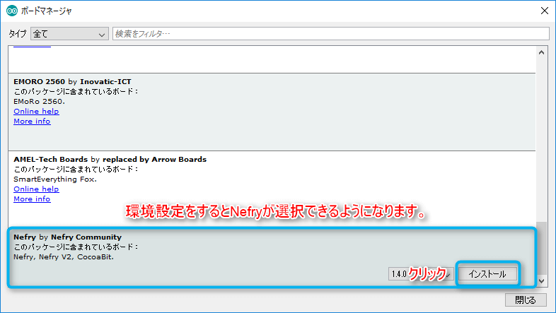 現在(2016/7/26)の最新バージョン(1.4.0)のボードが選択されているので、そのままインストールをクリックしてください。