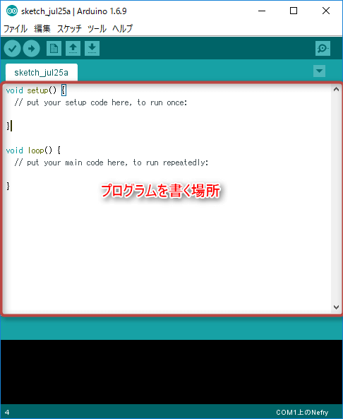 NefryはArduinoのIDEでプログラムを作ります。プログラムを書くところまでを写真を交えて説明していきます。