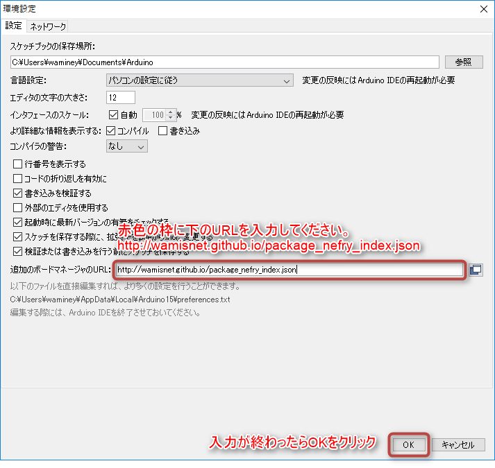 環境設定を開いて追加のボードマネージャーのURL に次のURL を入力します。