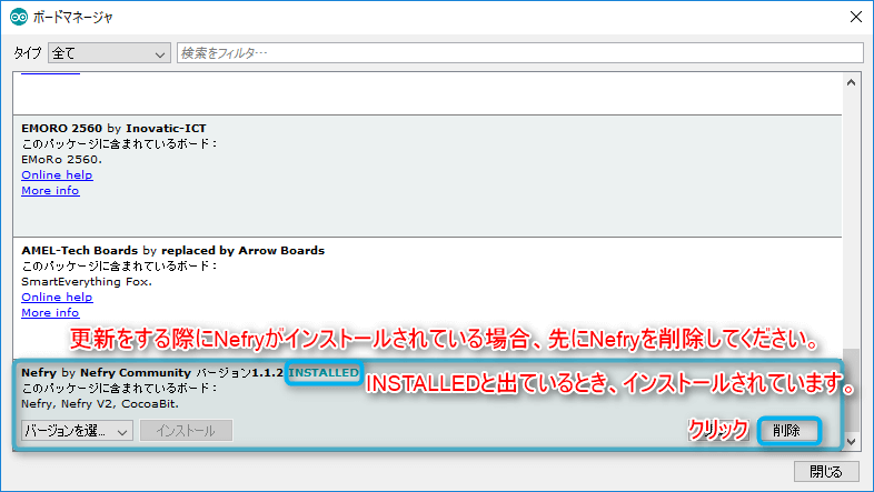 更新する場合、古いバージョンのボードが残っていると不具合が発生するので、先にアンインストールをします。