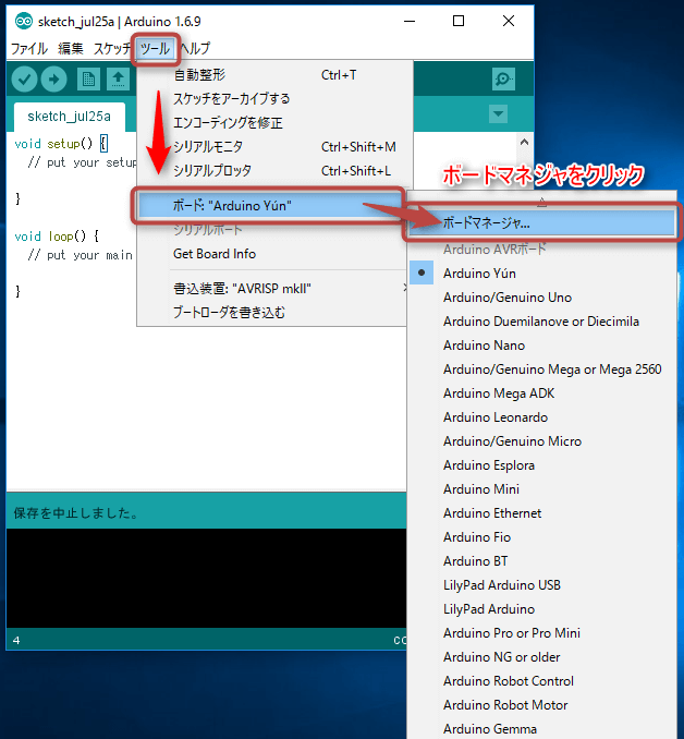 入力が終わったら、ツール内にあるボード選択のボードマネージャーをクリックします。