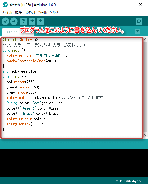 今回は、NefryについているフルカラーのLEDをランダムに光らせてみようと思います。