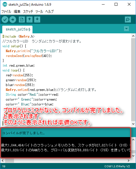 プログラムに問題がないとコンパイルが完了しました。と表示されます。