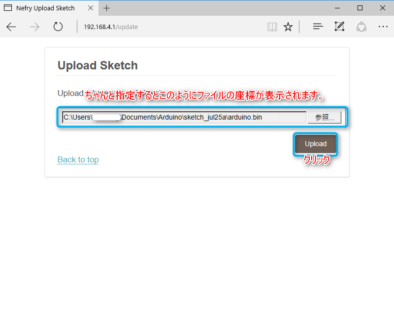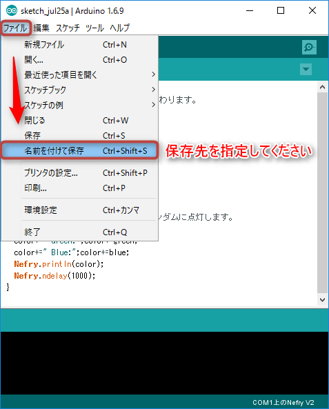 Nefryに書き込むプログラムがその指定した場所に保存されますので、保存する場所を覚えていてください。