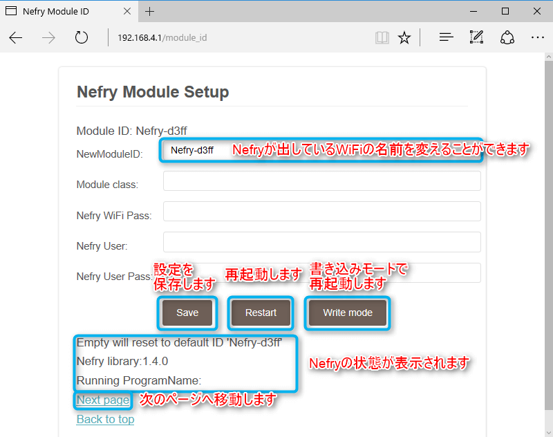 そうするとNefryが再起動するので、再起動が終わったら書き込みモードになっています。