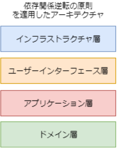 これまで最下層に存在していたインフラストラクチャ層が最上位に移動しています。これによって、永続化の変更や外部システムへの連携(データの取得・送信)の仕様が変更となっても下位のレイヤは何の影響を受けません(というよりはむしろ、影響を受けないように実装しなければなりません)。