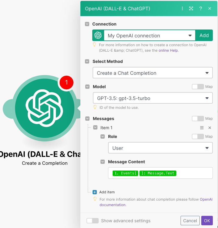 Select MethodはCreate a Chat Completion、Modelはgpt-3.5-turbo、MessagesのRoleをUser、Message Contentを
