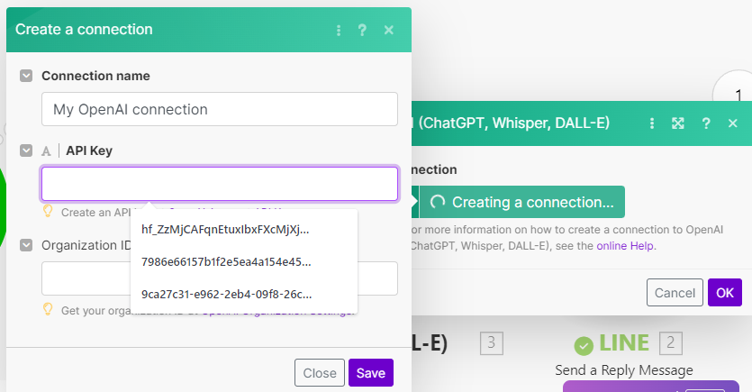 Create a Completion、gpt-3.5-turboを選んでください - 発行したAPIキーとアカウントのOrganization IDを其々コピーペーストします