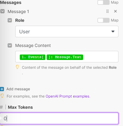 User、Message ContentのところにはEvents[]:Message.Textを入力してください。これでLINEに入力した言葉でChatGPTのAPIを叩くことができます