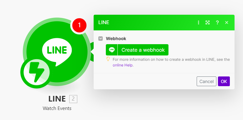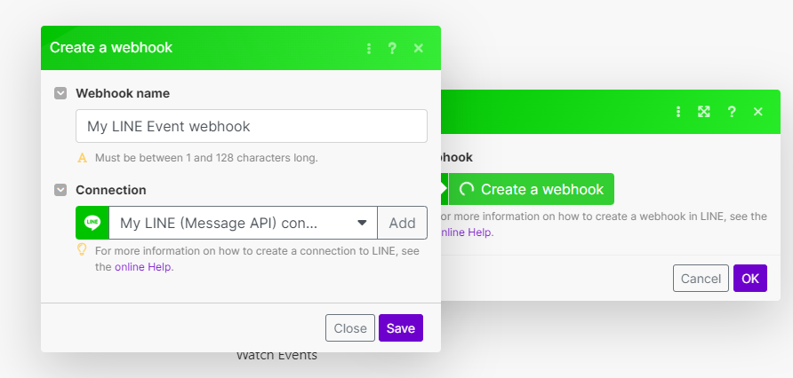 Create Webhookボタン、Create a connectionボタンを順次クリックし、LINE Developersより取得したCHANNEL ACCESS TOKENを貼り付けてください