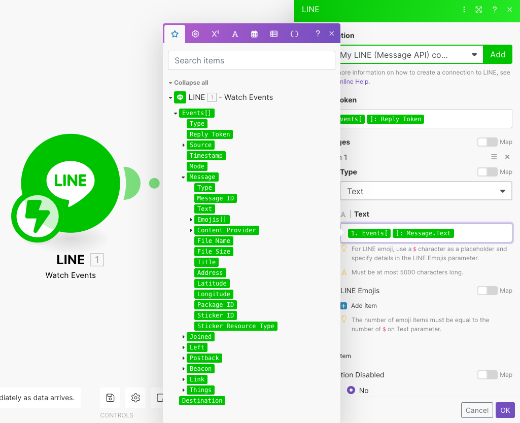 - Reply TokenとTextの部分を画像の通りに設定。利用者側からMessaging APIを通して送られてきた情報より、Reply Tokenとテキスト情報を抜き出すイメージです
