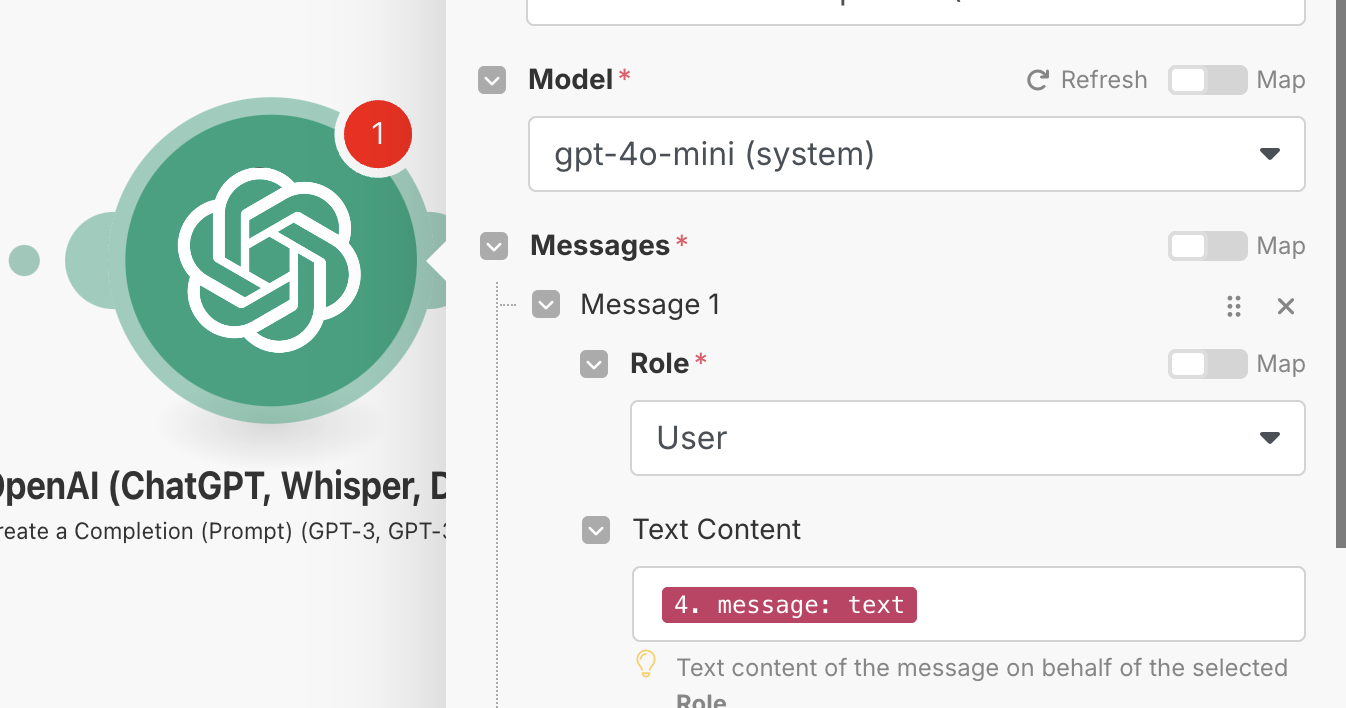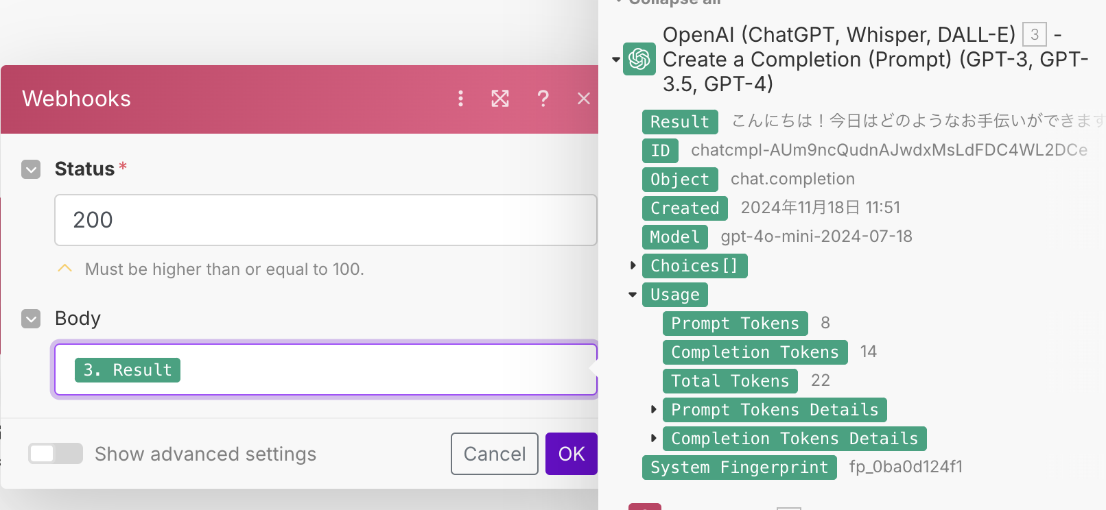 - webhooksのBodyにOpenAIから返ってきた値を入れます