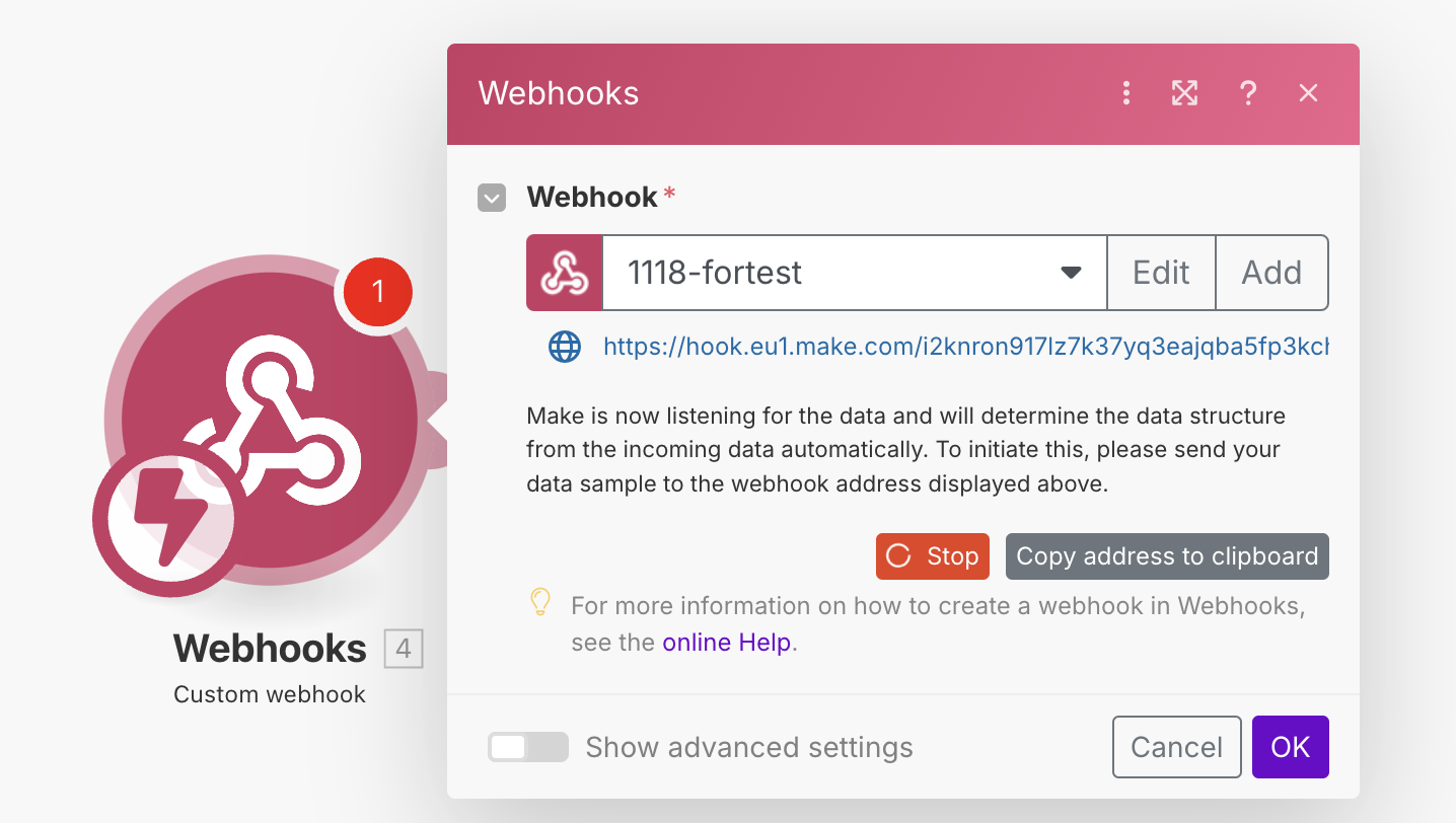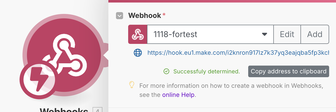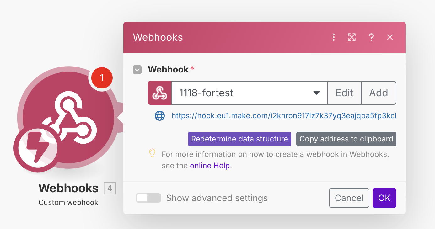 表示されていたwebhook URLに対して、実際のリクエストを送ることで、データ構造を定義して、makeの中で使えるようにしてくれます。