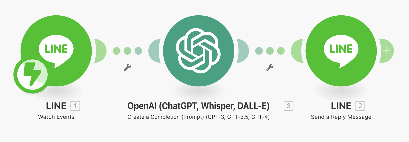 今回はCloudflareからmakeにリクエストを送り、makeの中で具体的なロジックを実行(サンプル例はGPTのAPIです)。再度Cloudflareに返して、結果を返答するLINE Botを作成します。