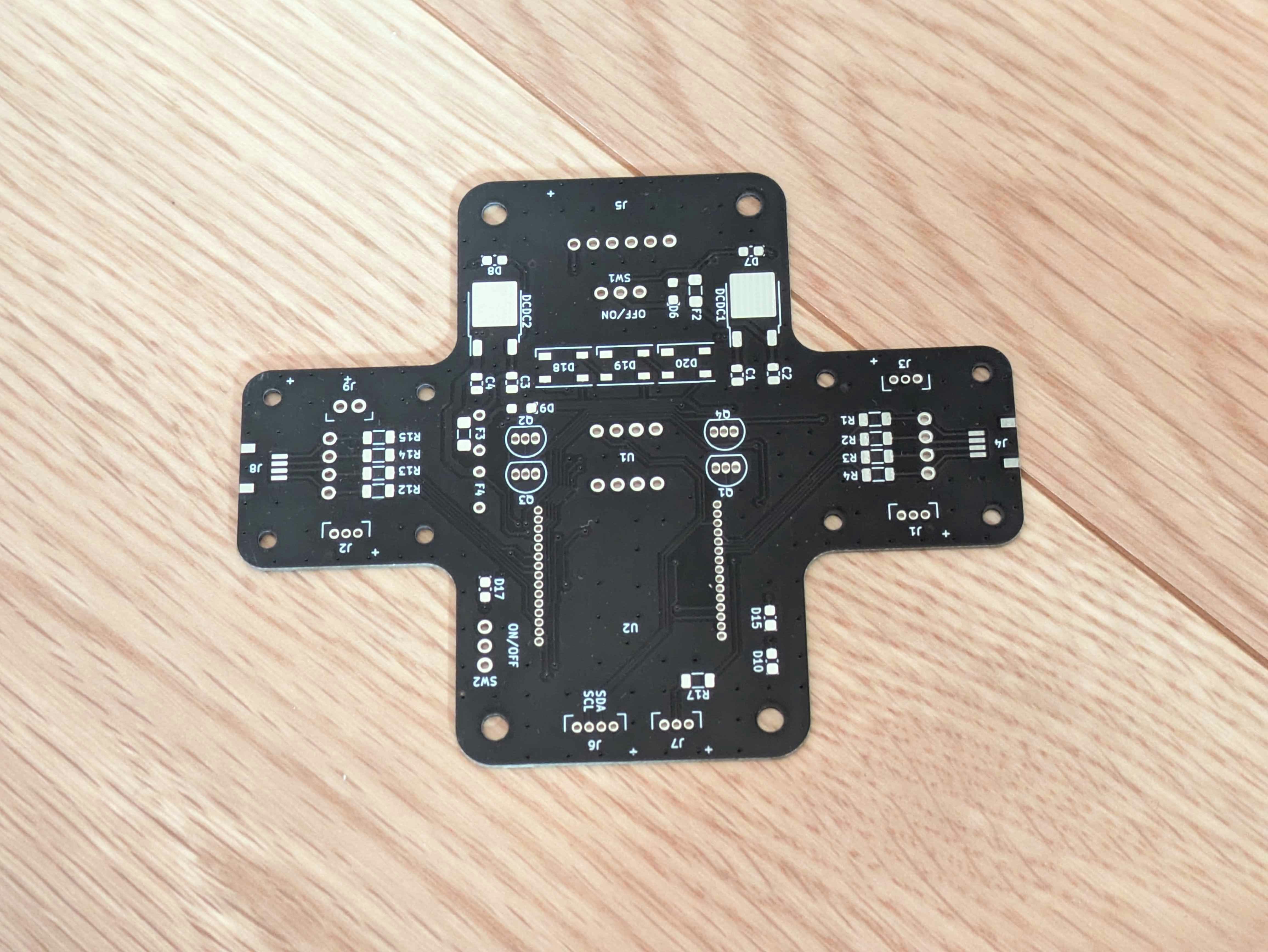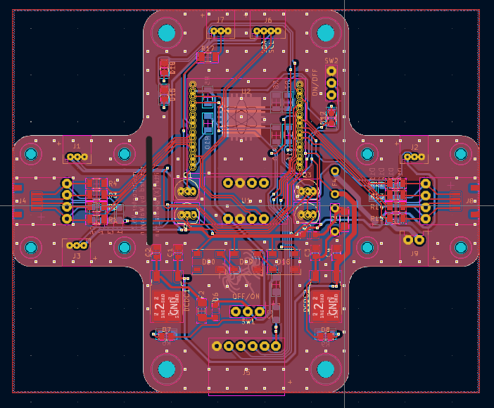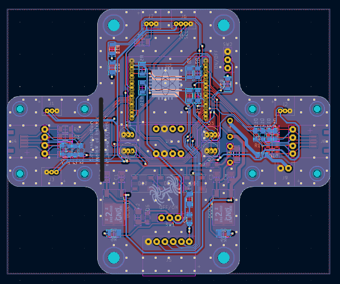 設計はこんな感じです。SEKIREI基板の形は少し特殊ですが、これには意味があります。左右に飛び出ている部分はESCとサイズを合わせており、4in1タイプのESCを左右それぞれ1つ固定することができます。これで8つのモーターを制御できるというわけです。