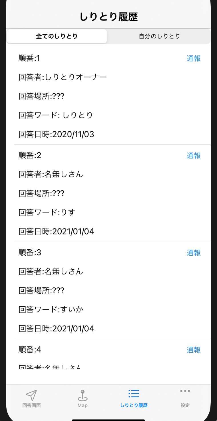 これまでのしりとり経歴を表示する。自分の回答のみフィルタすることも可能。