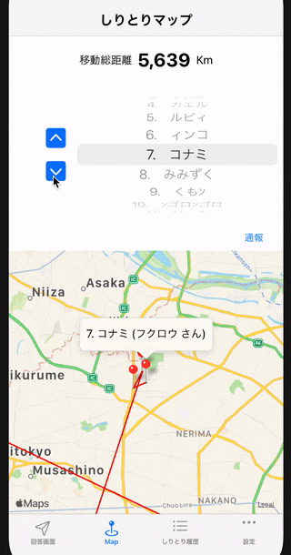 しりとりの入力場所を地図上に表示する画面。本アプリの目玉。回答地点のピン間をアニメーションで繋いだのがポイント。