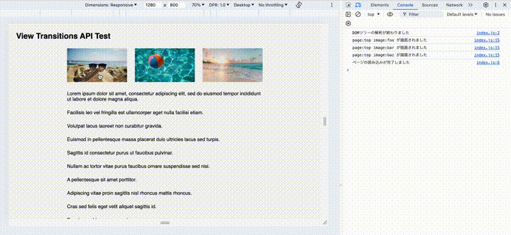下記の条件でView Transitions APIを使用した際、していない際で挙動を比べていました。