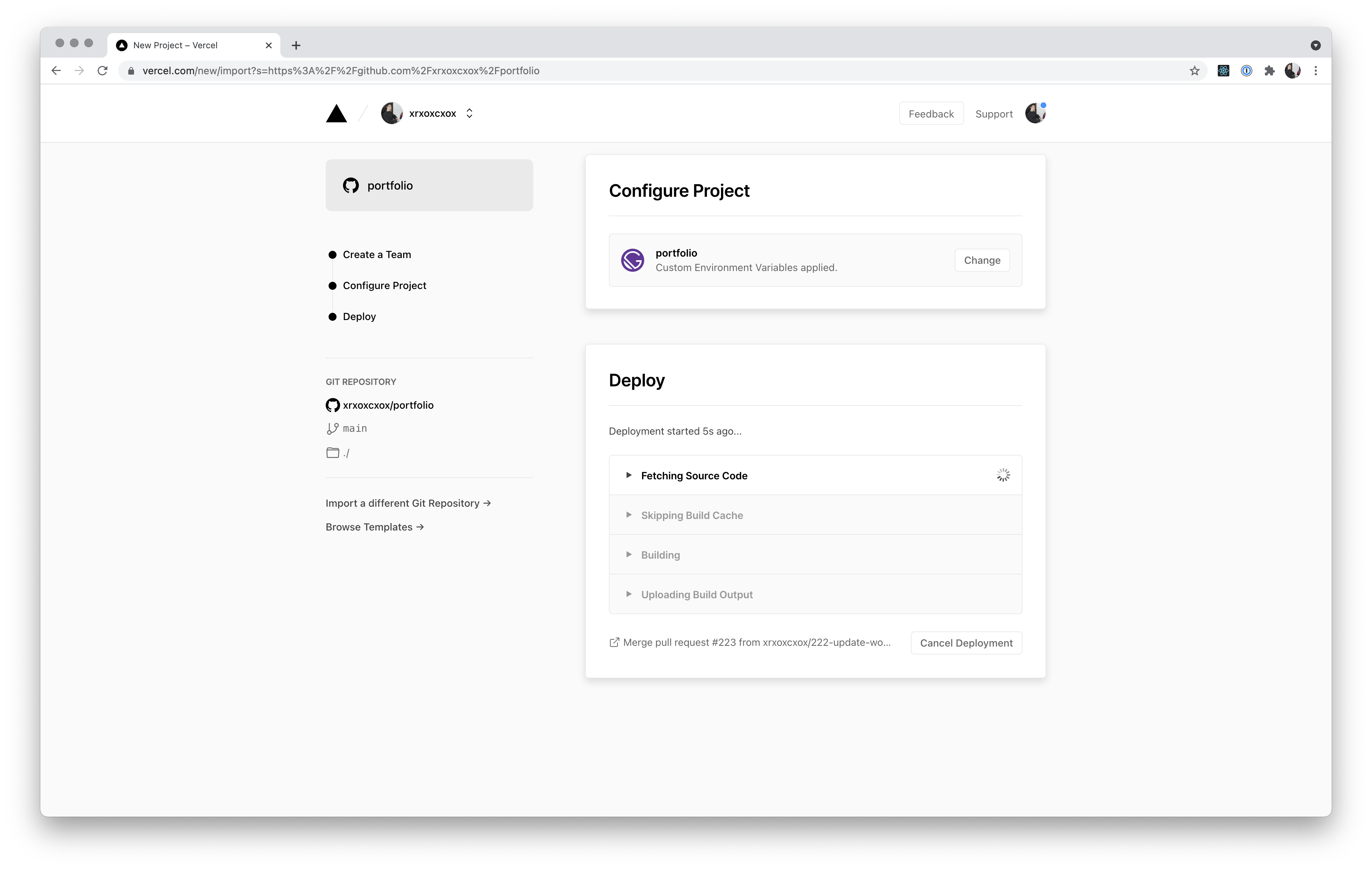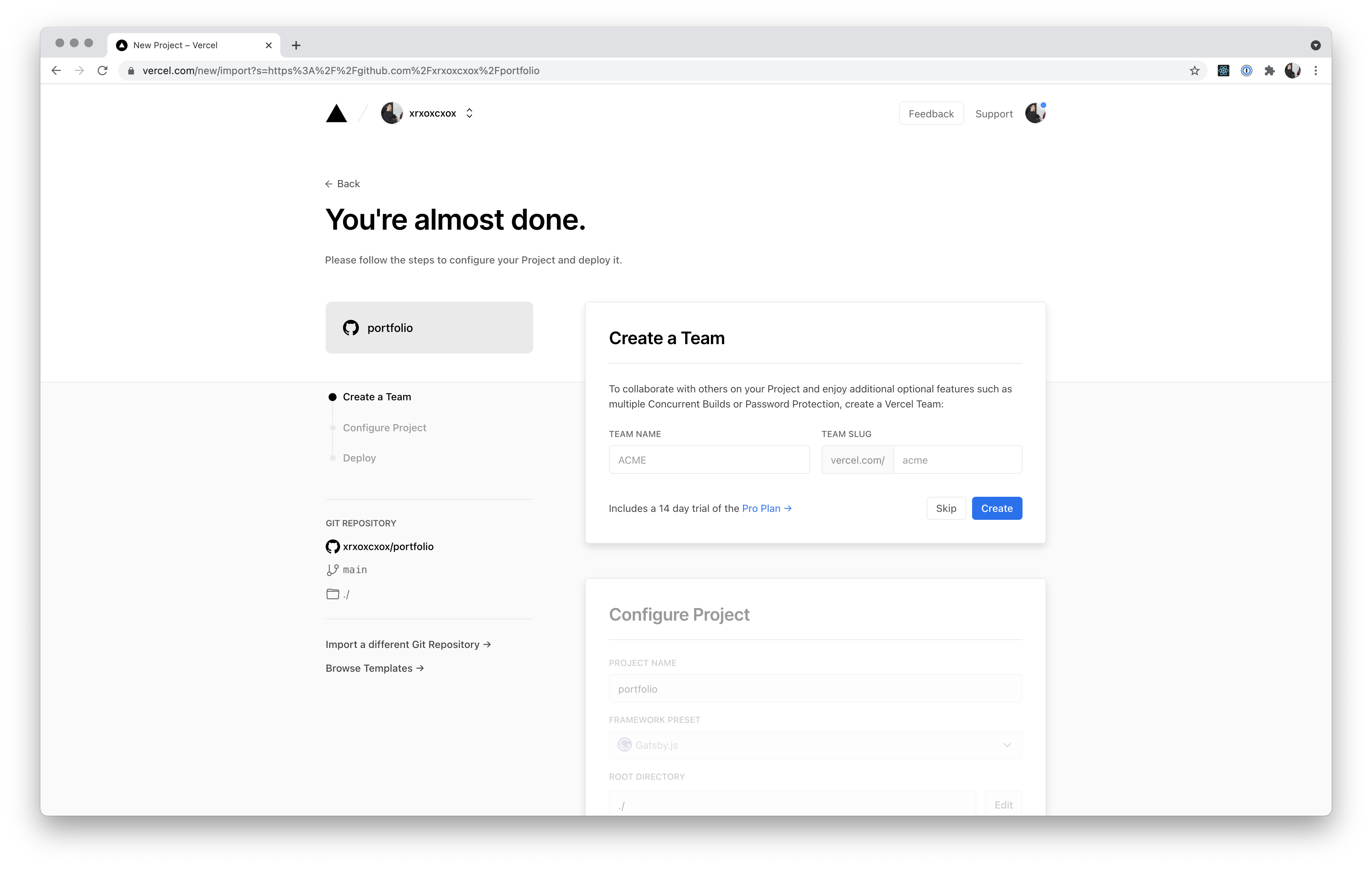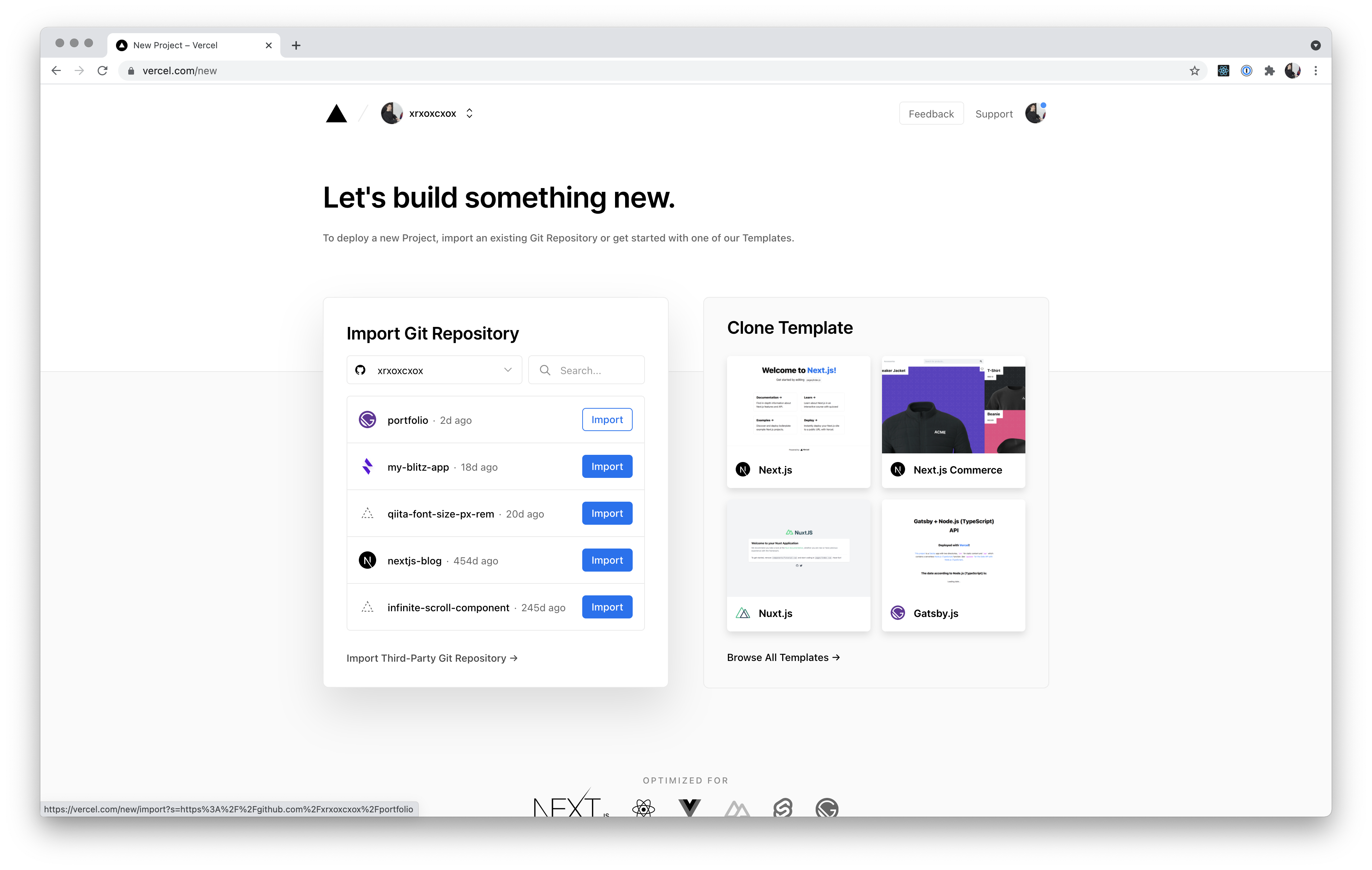 Importするリポジトリを選択するビューに移動するので、今回はportfolioを選びます。