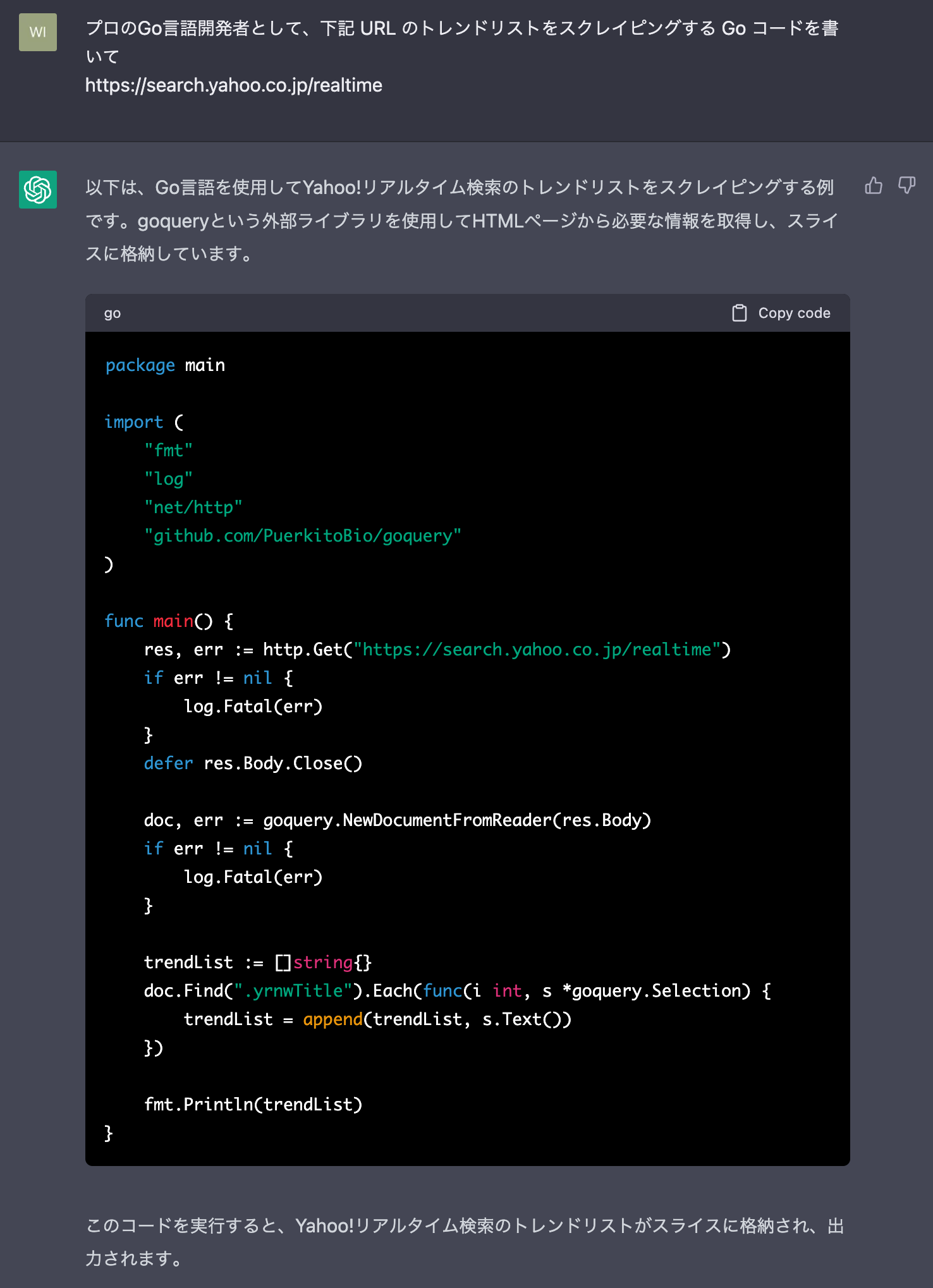 ただ、自分で作った記事とは別のライブラリを使っていたので、記事で実際に利用した Colly を使ってもらった場合も教えてもらいました。