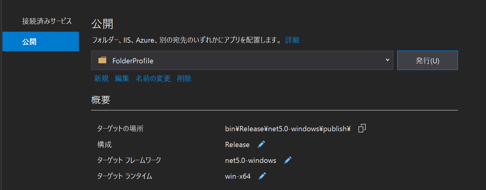 配置モードを「自己完結」とターゲット ランタイムを、「win-x64」にします。