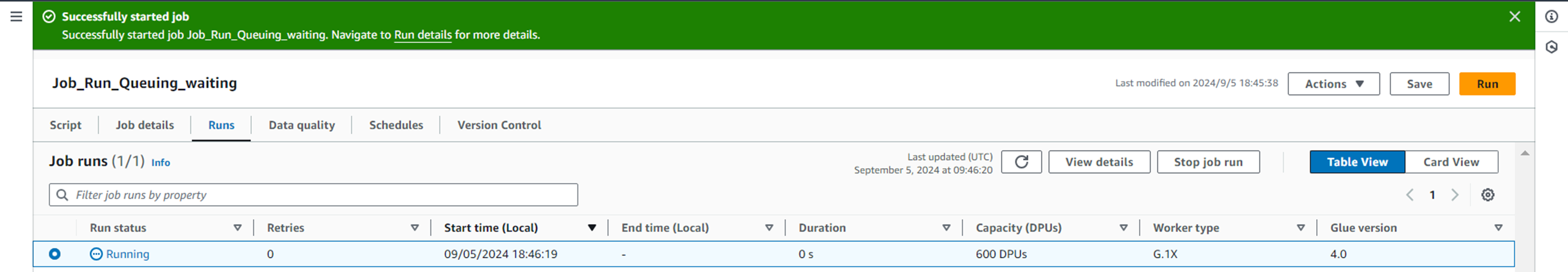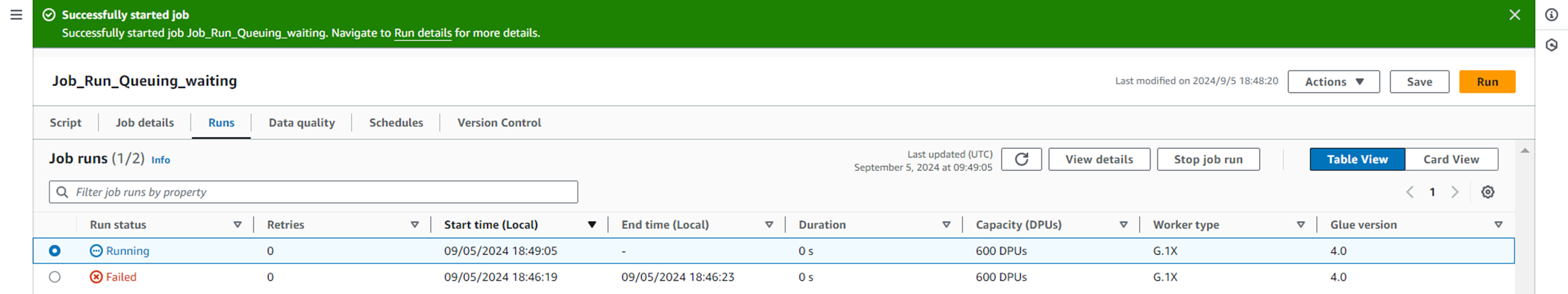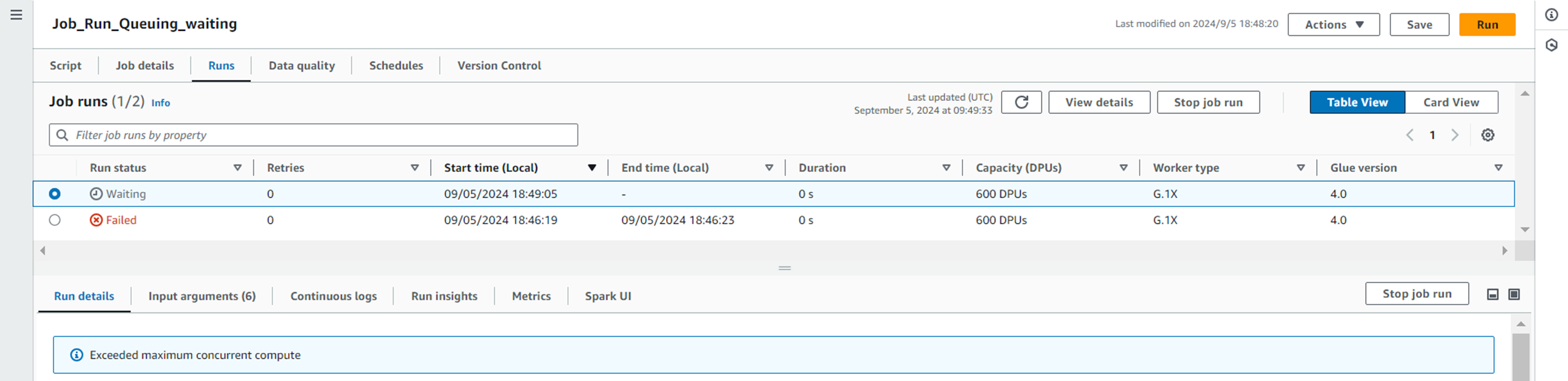 ジョブの実行を開始するためにクォータやリミットが不足している場合、Glue は自動的にジョブをキューに入れ、リミットが解放されるのを待ちます。