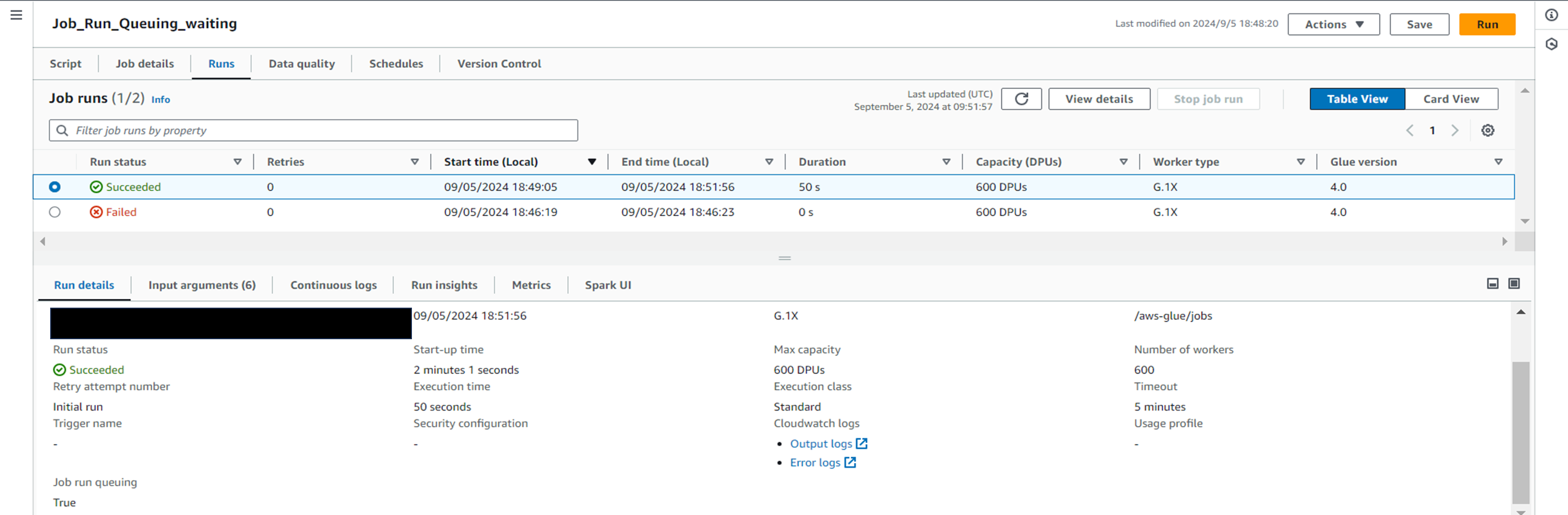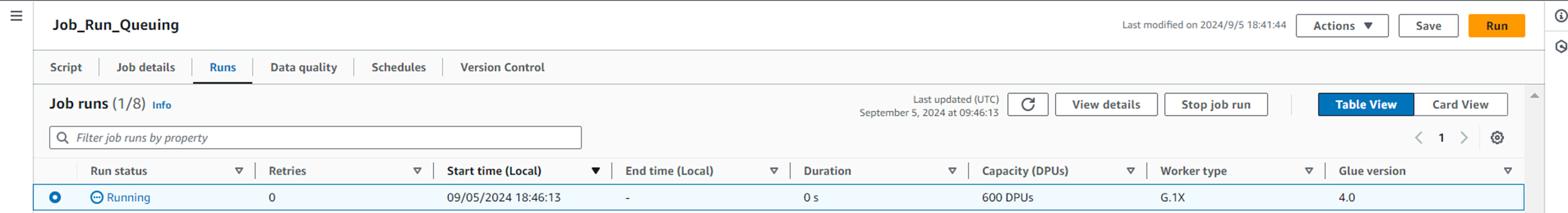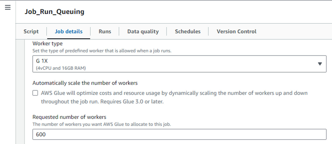 ジョブの実行を開始するためにクォータやリミットが不足している場合、Glue は自動的にジョブをキューに入れ、リミットが解放されるのを待ちます。