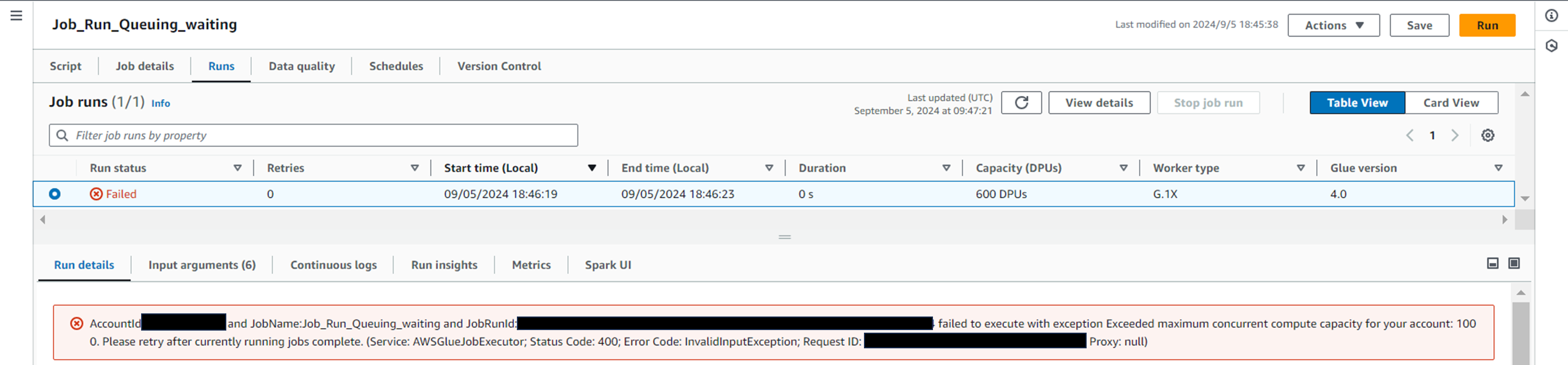 制限が利用可能になると、Glue はジョブの実行を再試行します。