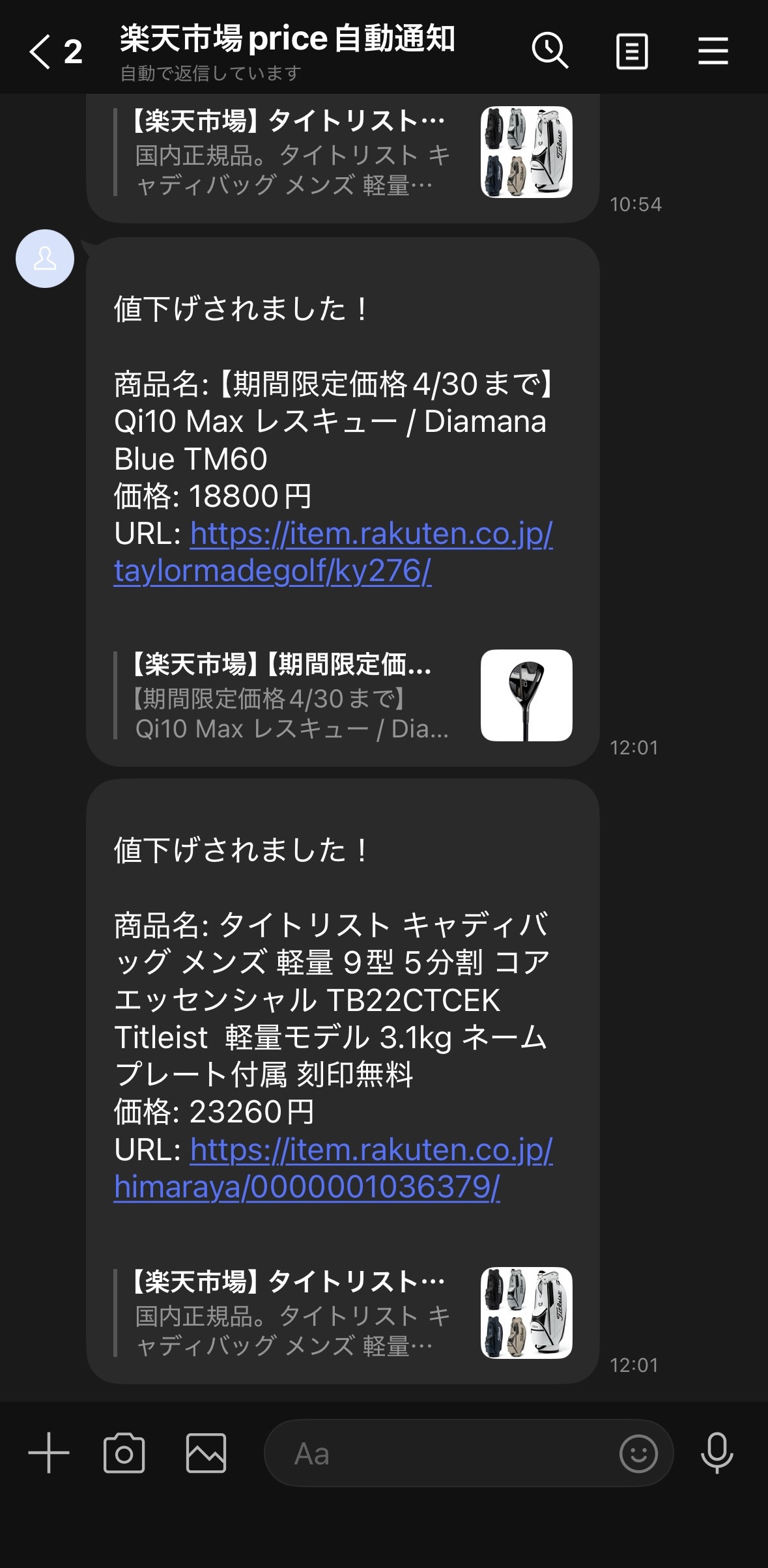 csvファイルの最後の行を読み取り、一行前のpriceから値下がりをしたら、LINEに通知を送ります。