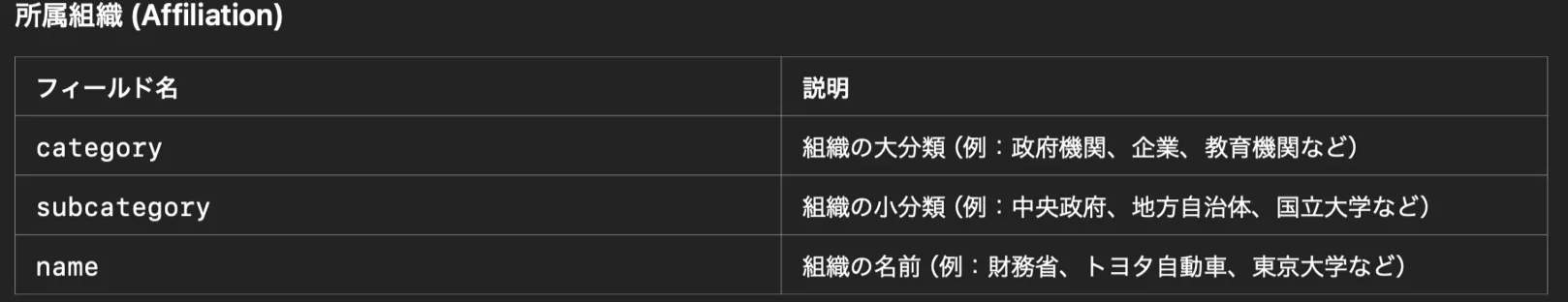 リンキングできたのはいいものの、Wikipediaのテキストは非構造的となっています。そのため政治家・官僚・学者・経済人などのカテゴリー、所属組織、活動分野など、人物属性を定義しデータをLLMを使って構造化していきます。