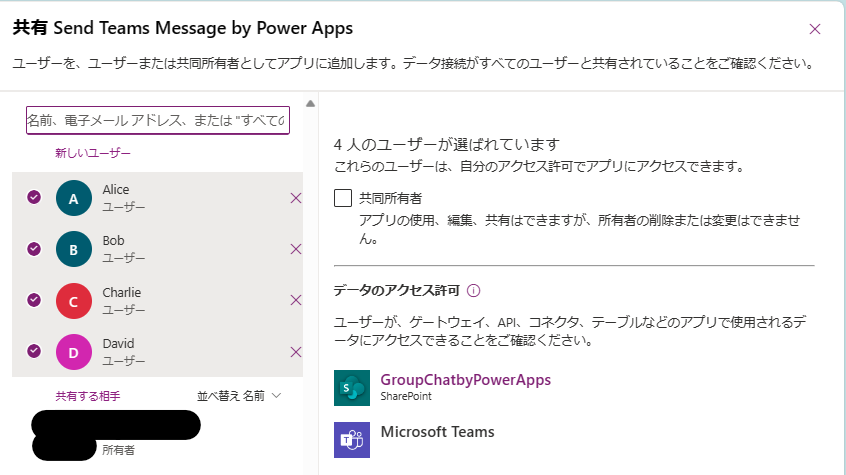 次に、追加したこの4つのアカウントに今回作成したPower AppsアプリとSharePointリストを共有します。