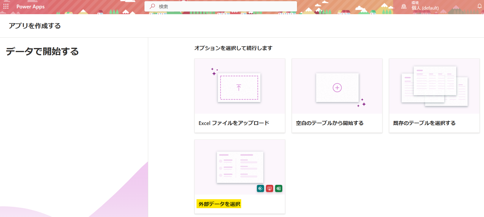 まず、Power Appsのトップページから、「データで開始する」を選択後に「外部データを選択」を選択します。