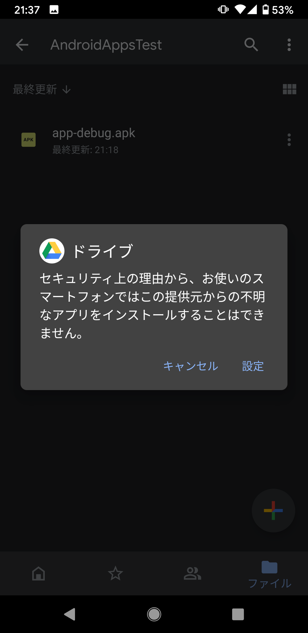 ファイルをタップすると、危険なアプリじゃない!?と疑われますので、[設定]をタップします。